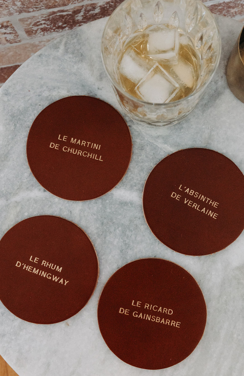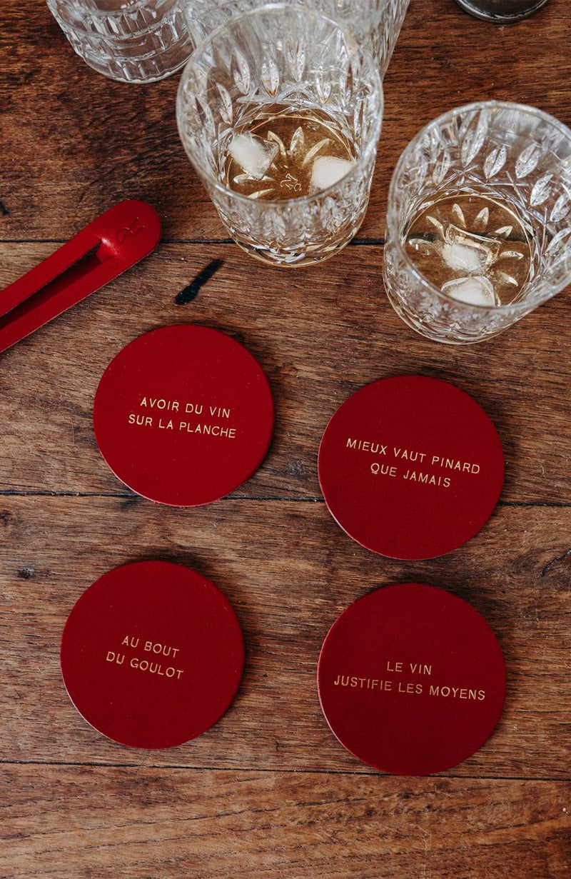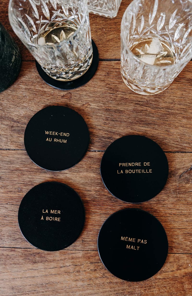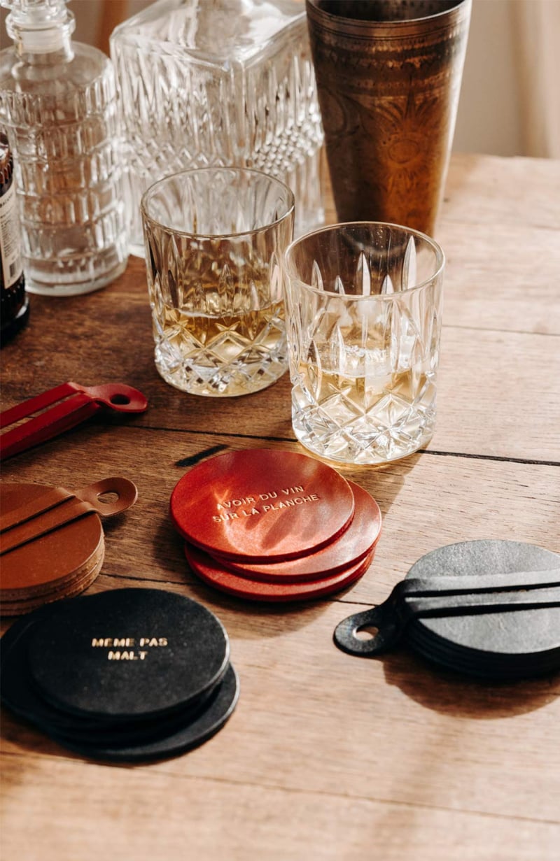 Des dessous de verre en cuir qui ne manquent pas de style. Un set pour rendre hommage à nos icônes, un dédié à nos Daddy (cool) et un qui reprend avec des expressions qui donnent toujours le sourire. Le petit dernier est gravé recto-verso pour choisir le personnage à incarner dans la soirée. Prêts pour une dégustation tout-terrain.