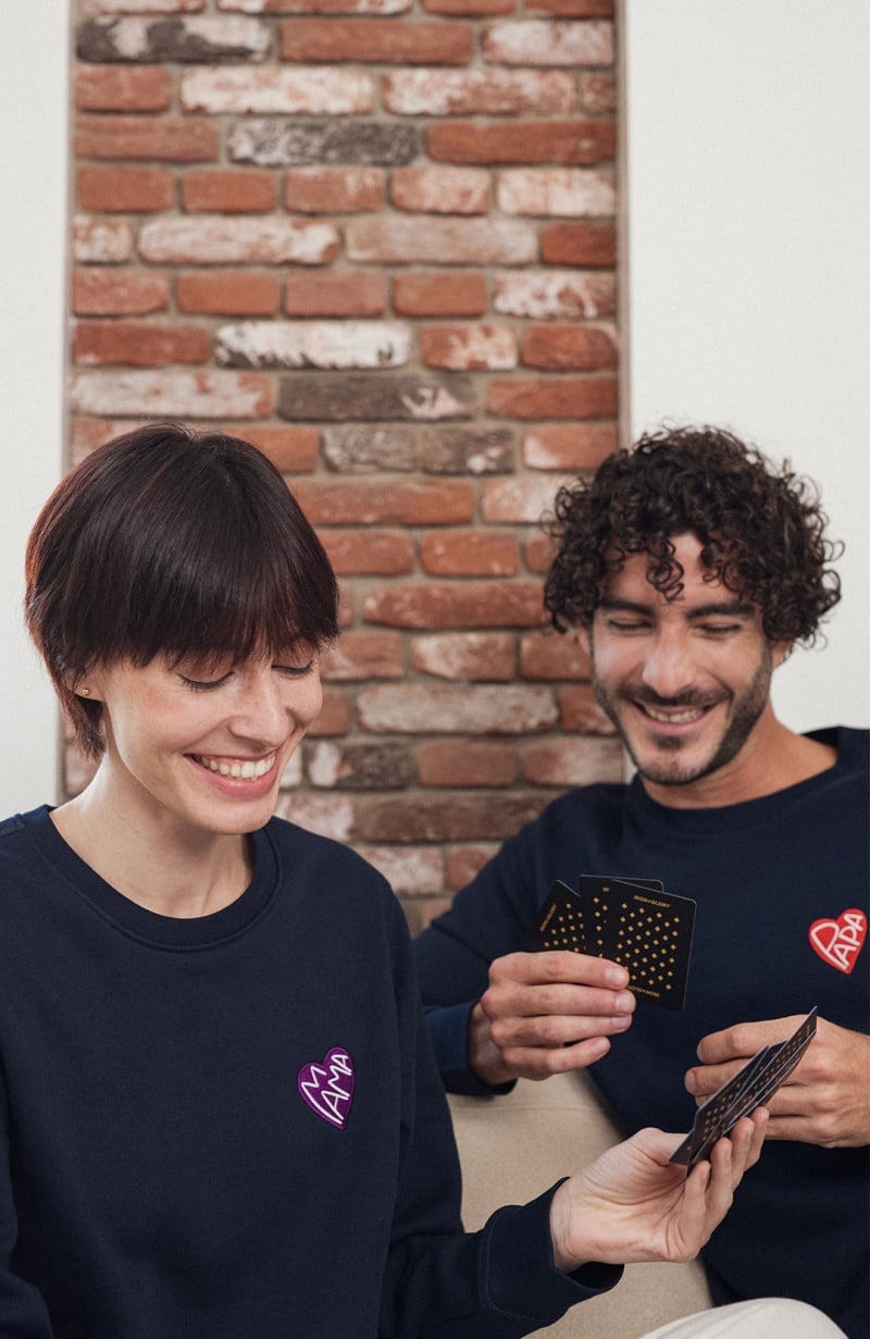 Pour les padres au look habilement travaillé. Un sweats navy aux lignes classiques comme on les aime, qui se la joue papa au cœur tendre avec sa broderie rouge sur la poitrine. Le compagnon tout doux des fridays wear et autres journées de TT. Mais aussi des sorties stylées en le twistant avec des pièces plus sophistiquées. Le tout en coton bio et polyester recyclé. À penser en duo pour aussi équiper les madres. Bonus : il est livré dans une boîte rétro en carton imitation VHS à personnaliser. Va-li-dé.
