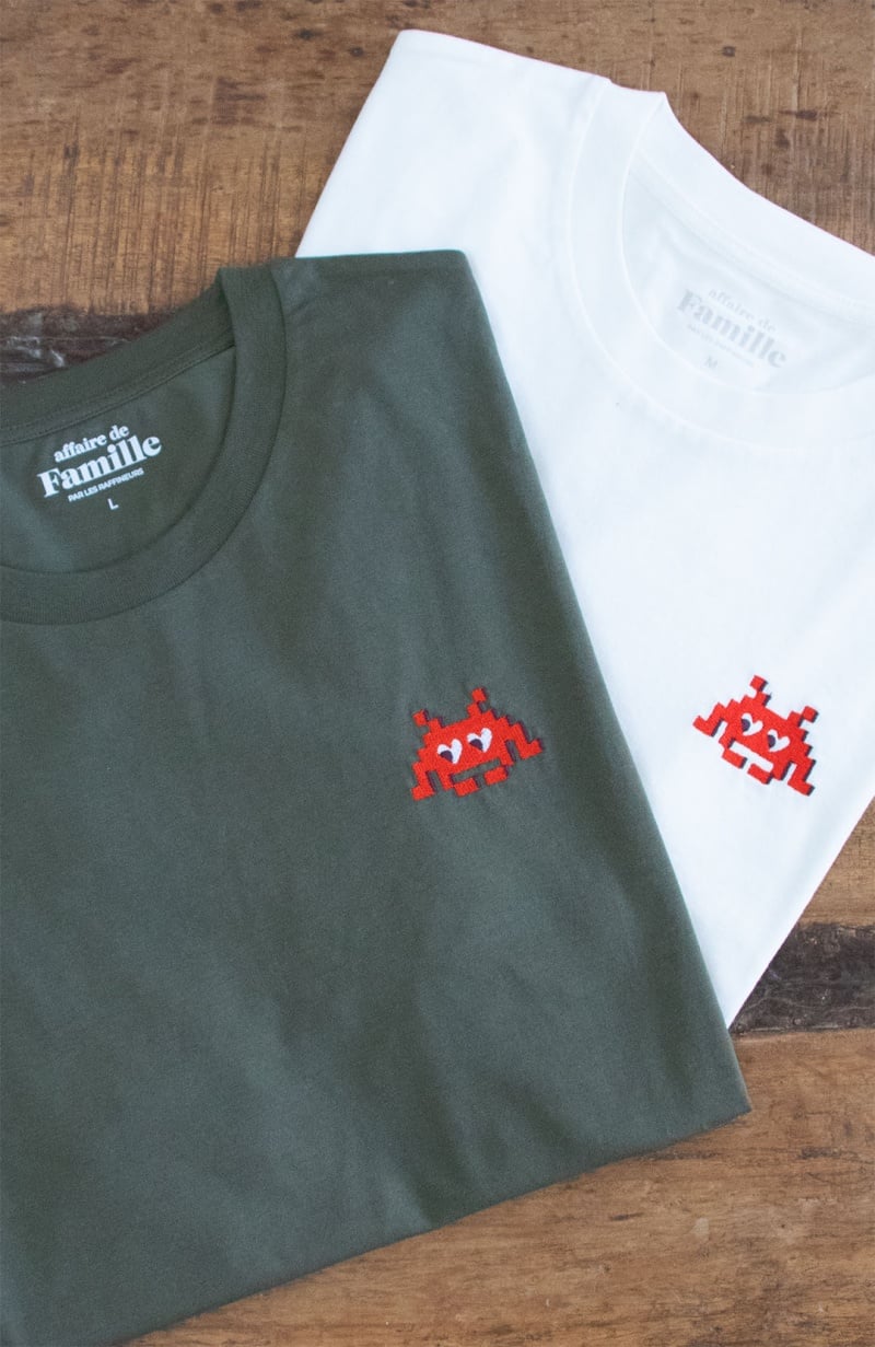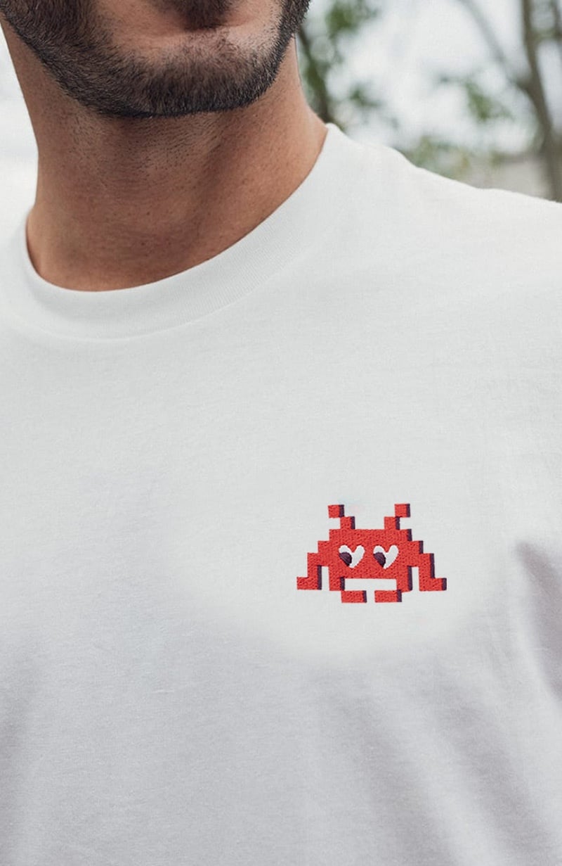 Il débarque tout droit des années 80, mais avec des cœurs dans les yeux. Ce petit alien brodé sur la poitrine donne un sérieux coup de love à l’iconique pixel. Un twist stylé, pile dans l’air du temps, à offrir aussi bien à son padre geek qu’à son pote resté bloqué au niveau 1 ou a son frangin fada des mosaïques arty. Côté qualité, on ne plaisante pas : coton bio, broderie made in France, coupe impeccable et coloris au choix. Résultat ? Un t-shirt qui coche toutes les cases. Level up.