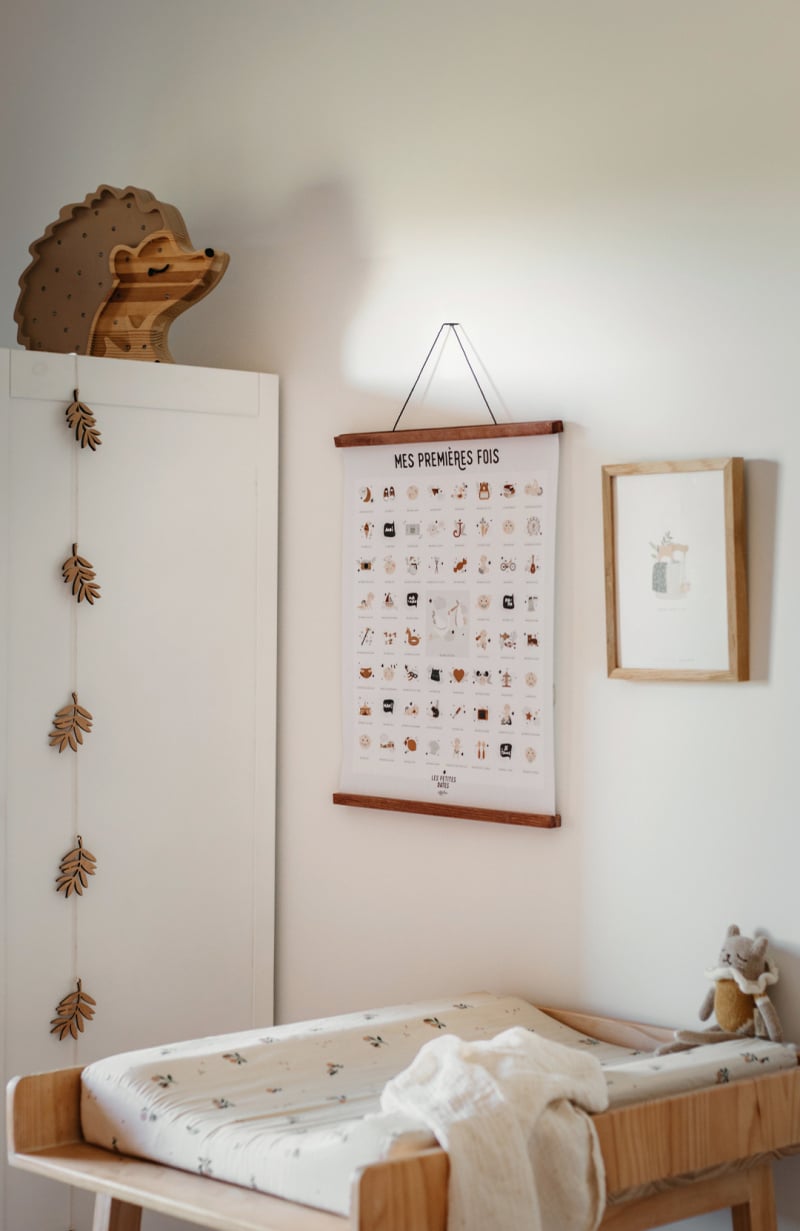 Premiers pas, première nuit dans son lit, premier mot, premier bobo, premier voyage, première glace… On craque pour cette adorable affiche de naissance au graphisme tout doux, sur laquelle on marque d’une pierre blanche (enfin, à l’encre noire) toutes ces premières fois plus importantes les unes que les autres dans la vie d’un mini. L’aventure commence.