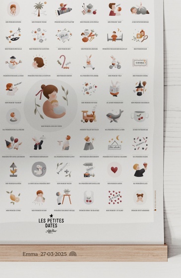 Premiers pas, première nuit dans son lit, premier mot, premier bobo, premier voyage, première glace… On craque pour cette adorable affiche de naissance au graphisme tout doux, sur laquelle on marque d’une pierre blanche (enfin, à l’encre noire) toutes ces premières fois plus importantes les unes que les autres dans la vie d’un mini. L’aventure commence.
