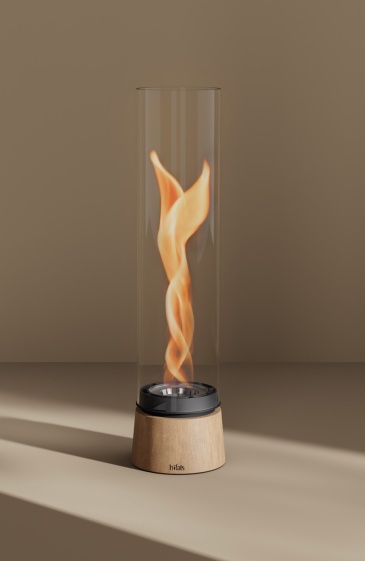 - Placer le bioéthanol dans le réservoir, allumer le feu, puis positionner le cylindre de verre par-dessus.