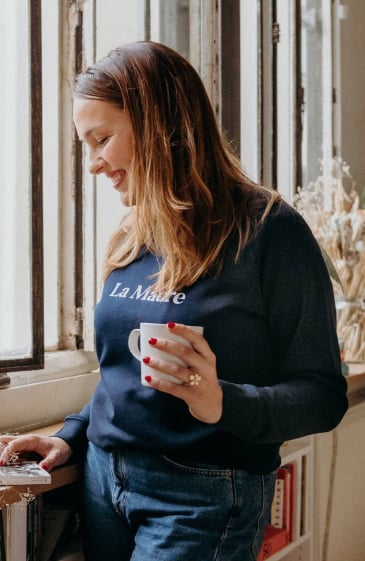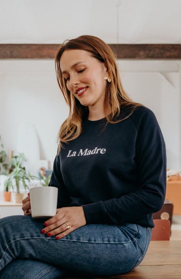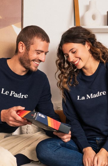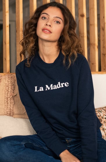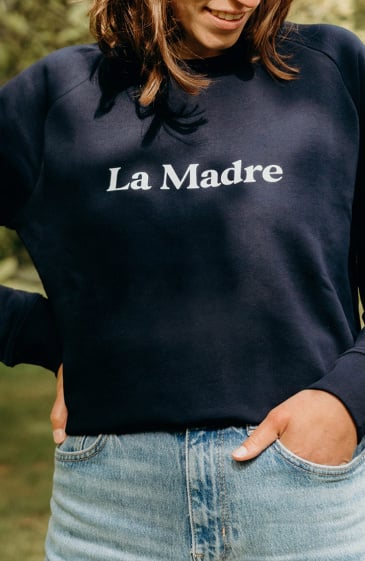 La Madre, celle qui finit toujours par avoir le dernier mot dans les Affaires de famille. Celle qu’on écoute, celle qui nous aiguille, celle des conseils bien avisés. Il faut bien l’admettre, elle a souvent le dernier mot. Chapeau. Alors ce sweat, c’est un peu une façon d’imposer son style, sa place, avec un air un peu rétro : c’est la madre, quoi.