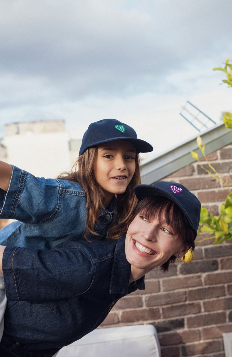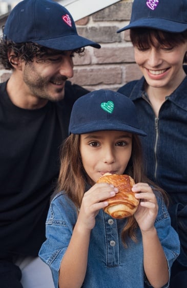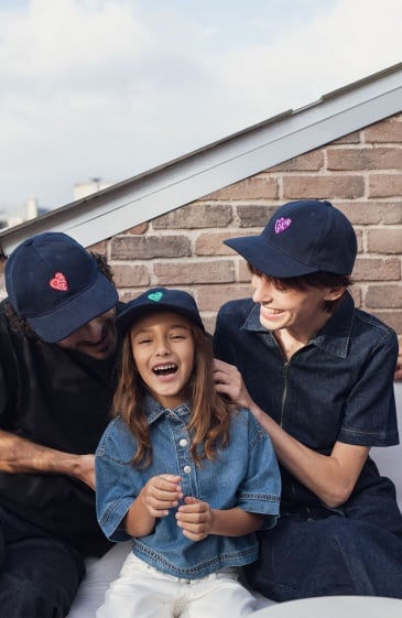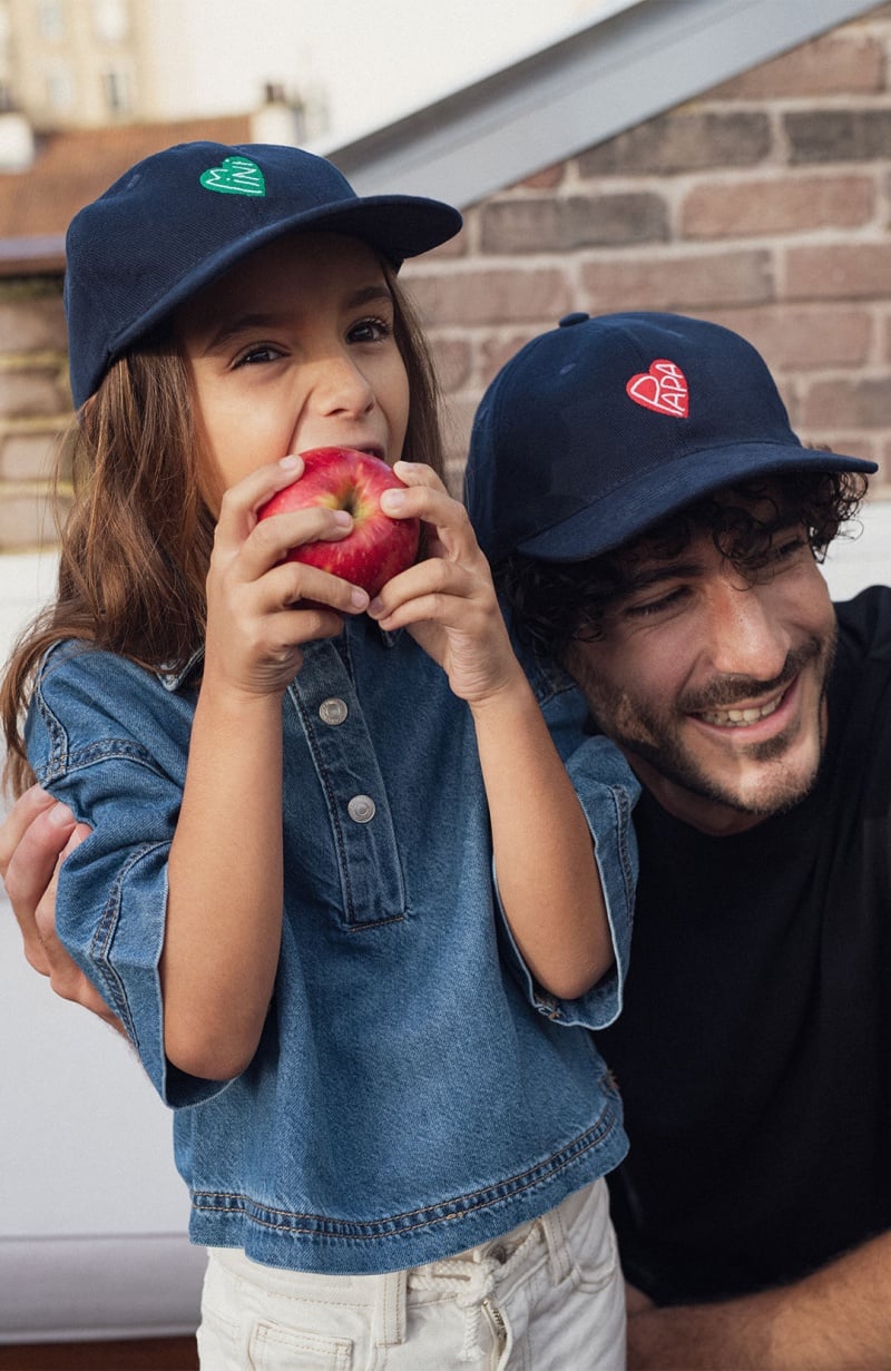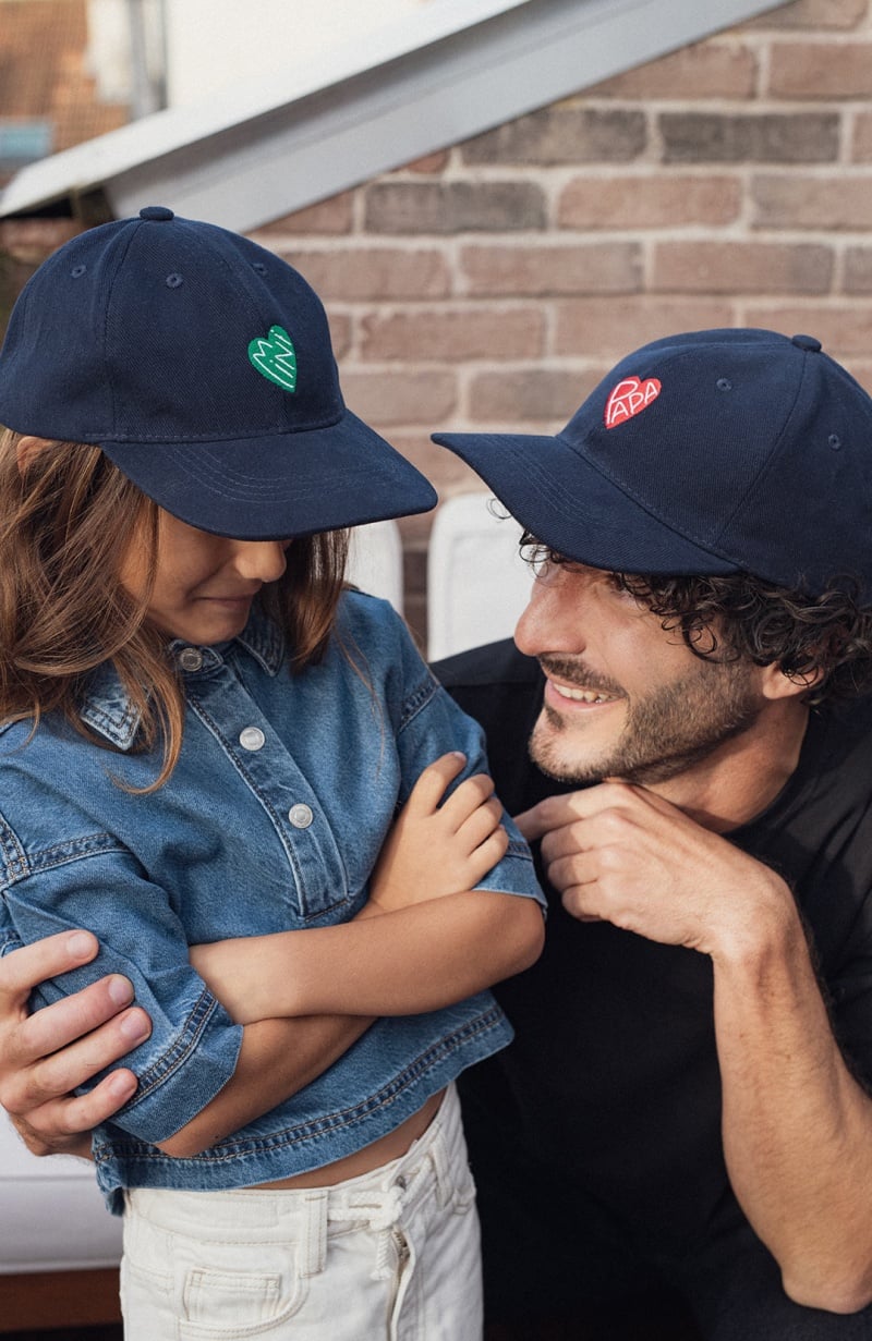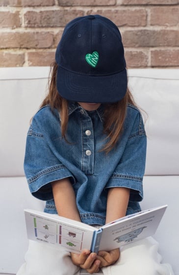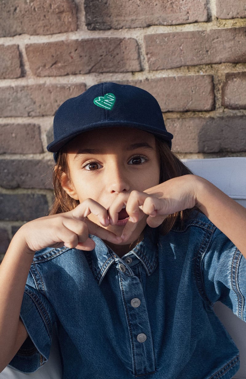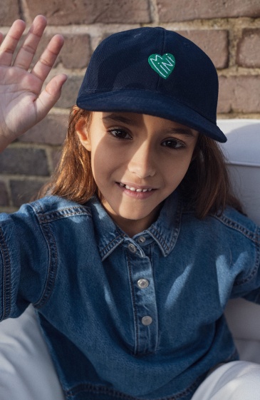 Pour les minuscules qui assument leur petit cœur de beurre avec style. Un élégant couvre-chef en coton bleu profond rehaussé d’un cœur vert vibrant qui dit mini avec douceur. De quoi s’abriter avec confort du soleil et de la pluie à midi comme à minuit. Surtout quand papa et mama s’équipent eux aussi. Team mimi.